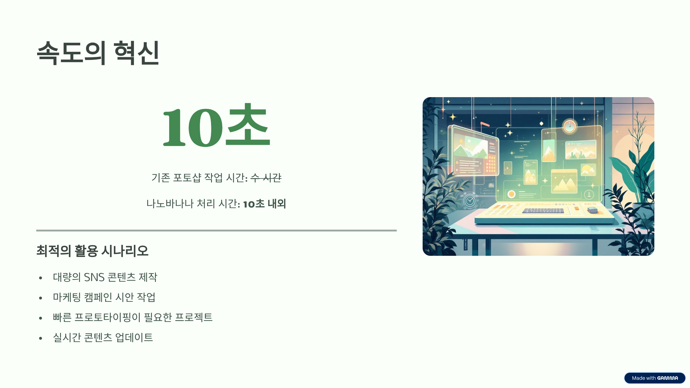 - 포토샵으로 몇 시간 걸리던 편집 작업 → 약 10초 이내 완료