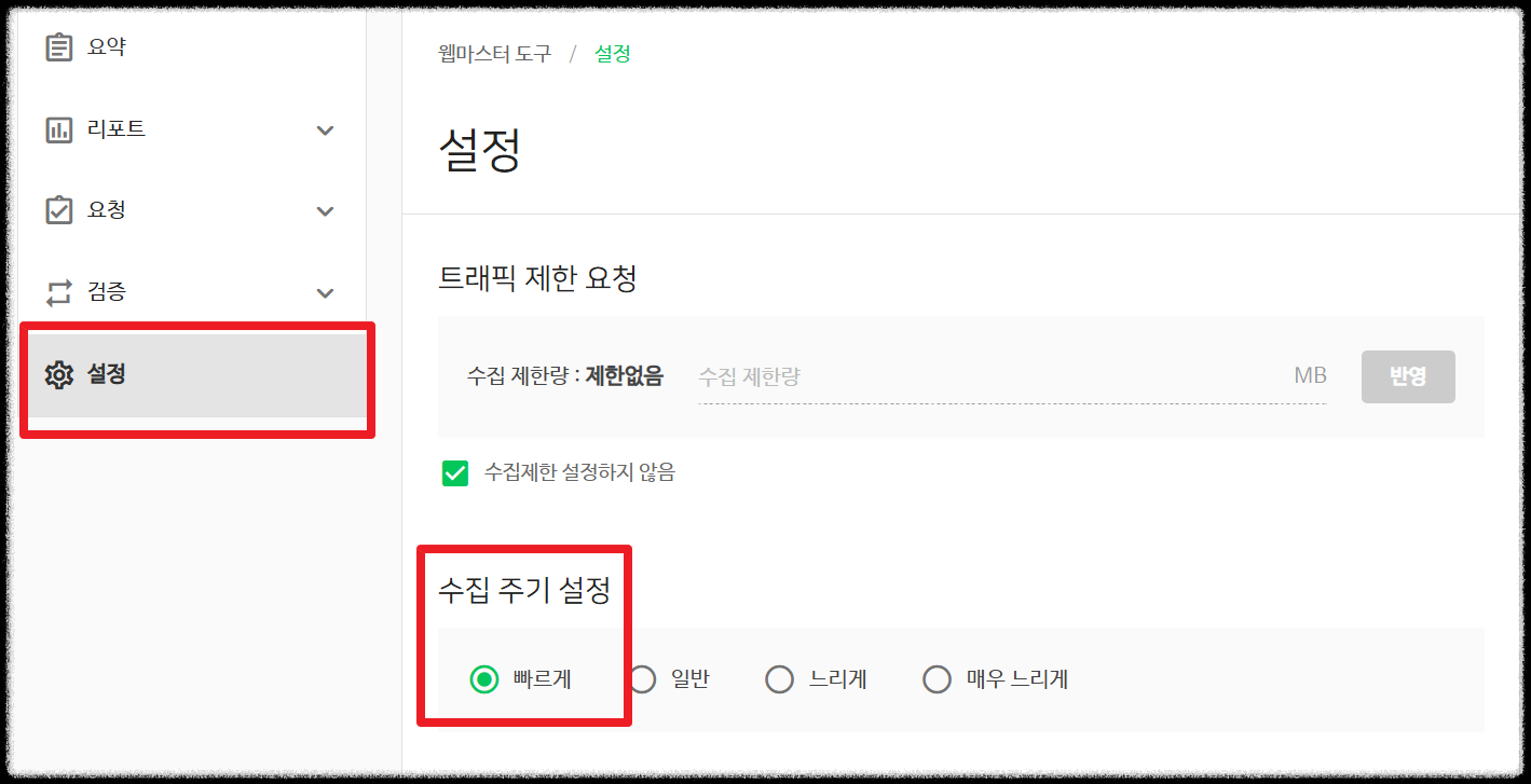 설정 메뉴에서 수집기 속도를 "빠르게"로 설정합니다.