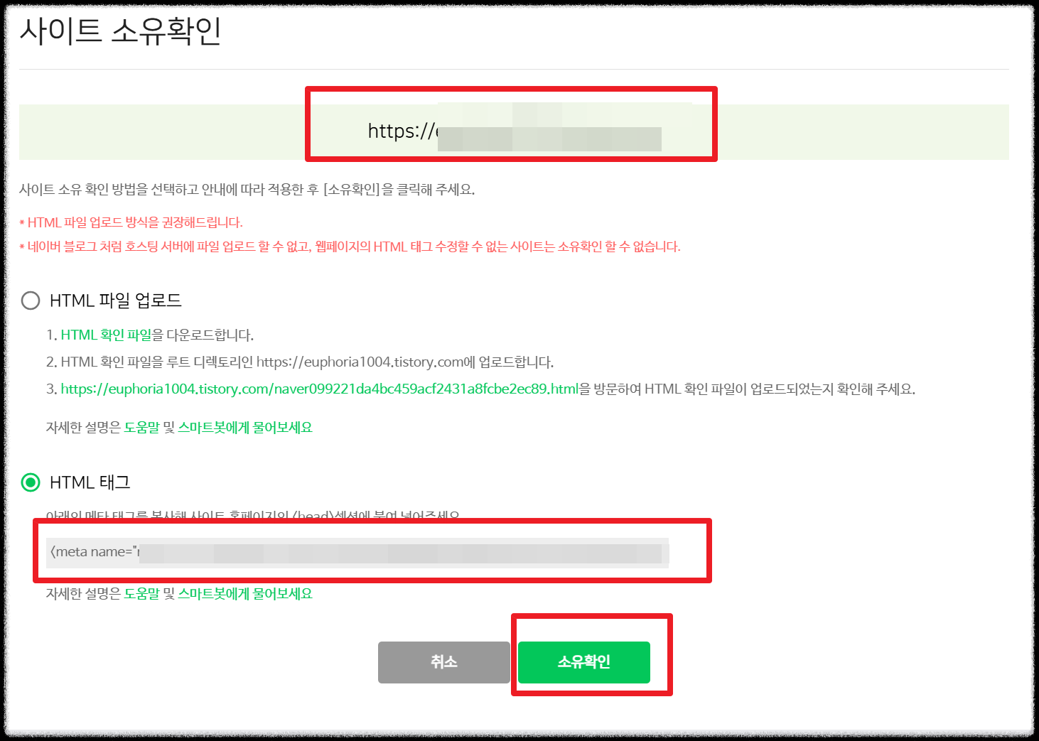 저장 후, 웹마스터 도구에서 소유 확인 버튼을 클릭하여 인증을 완료합니다.