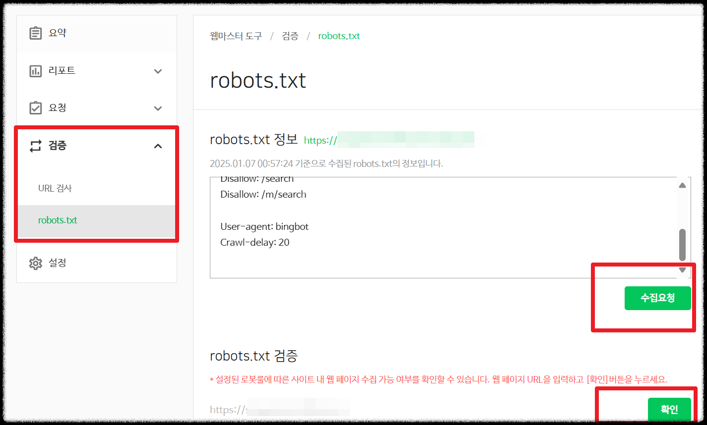 검증 메뉴에서 robots.txt 수집 요청을 실행합니다.